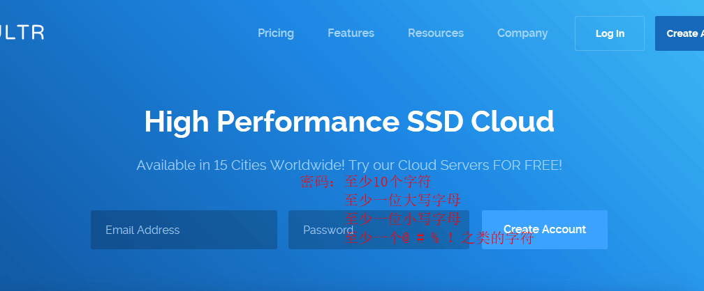 建议清除浏览器缓存和cookies打开上面地址,点击vultr直达地址,进入如下界面输入邮箱地址和密码,点击Create Account创建一个新账户。