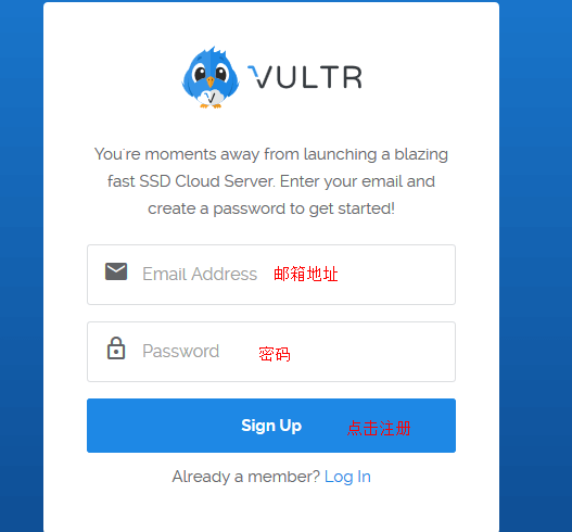 输入自己邮箱及密码(注意: vultr passwd 账户密码必须至少10个字符,并包含至少1个小写字母,1个大写字母和1个数字。),点击注册即可创建一个新账户。注意:这个是一个新注册用户的优惠活动,所以需要新的账户。