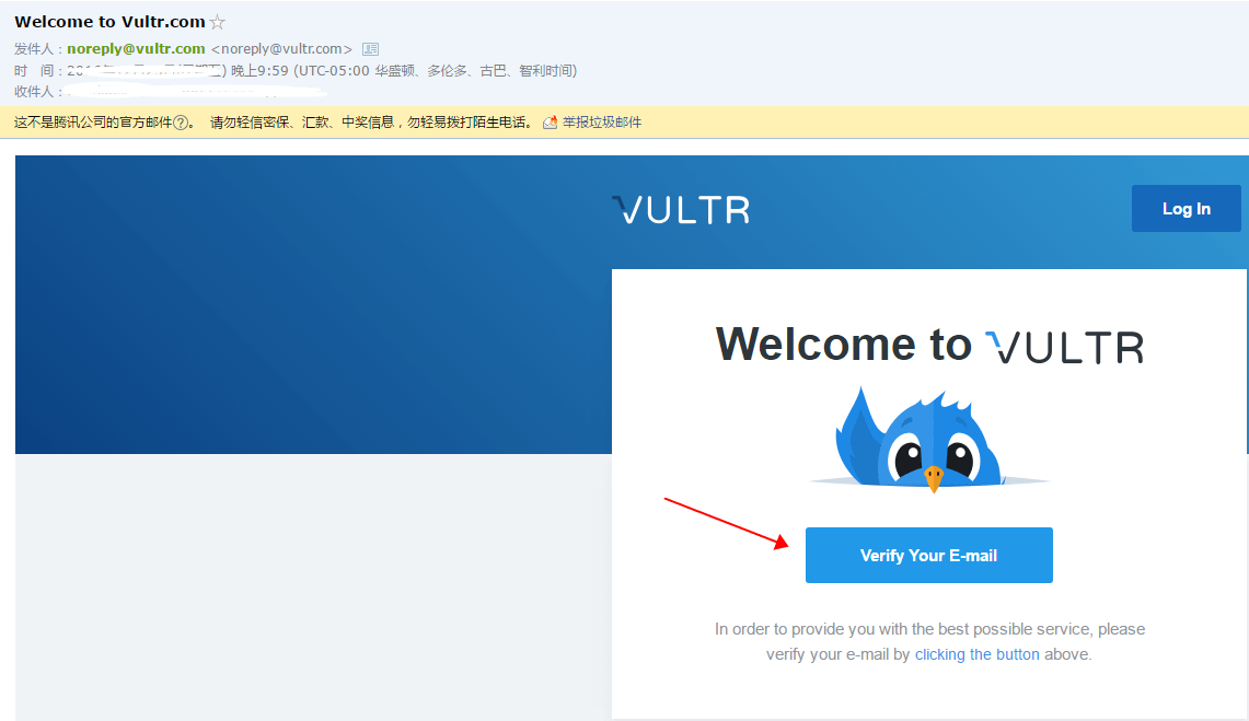 注册完毕,vultr会给我们发送一封验证邮件。我们需要第一时间打开注册的邮箱地址完成邮箱验证才能继续使用。验证完成,会返回到billing页面,填写支付信息。
