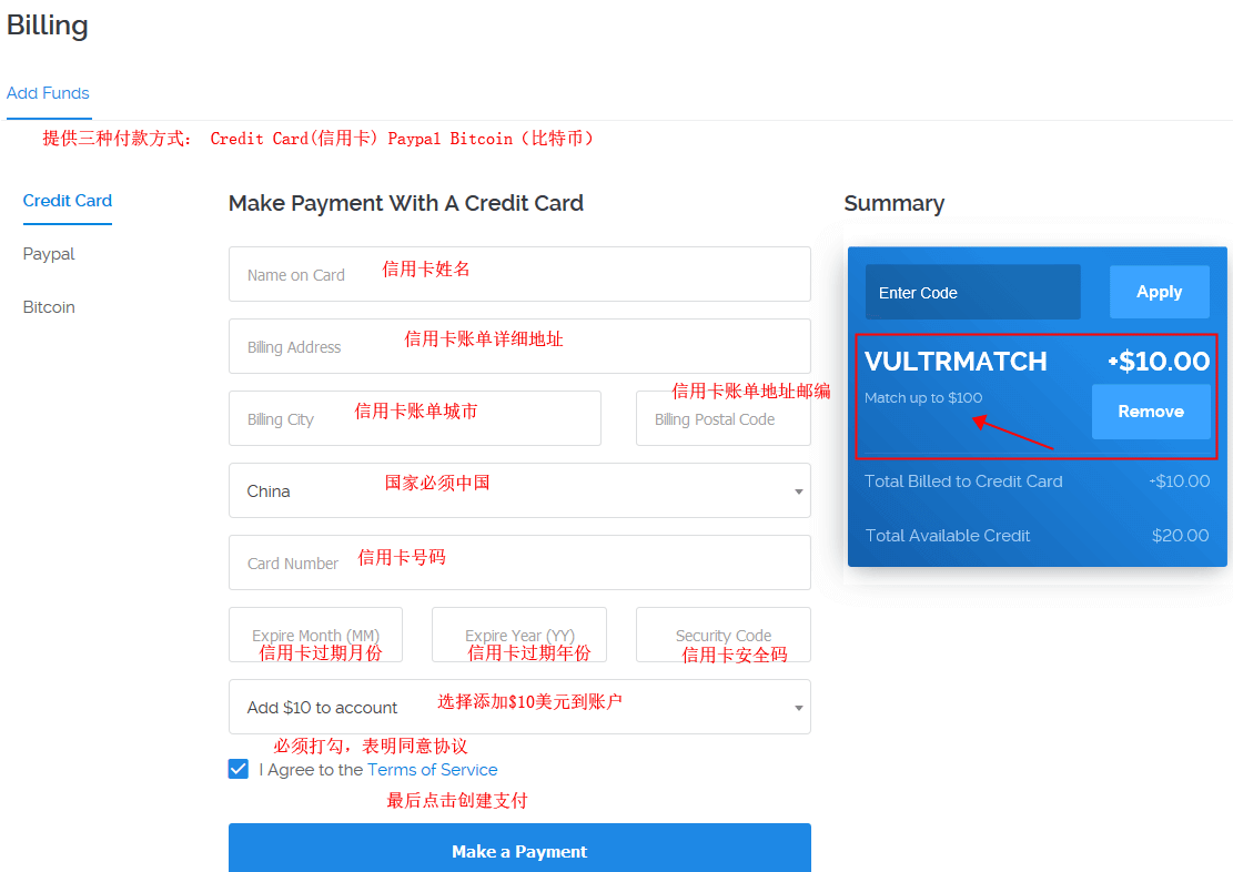 填写信用卡信息,这个会预扣信用卡款$2.5美元,后面会返还到信用卡中。另外在Enter Code 处使用优惠码 :VULTRMATCH 可以获得vultr冲 多少送多少最高送100美元。
