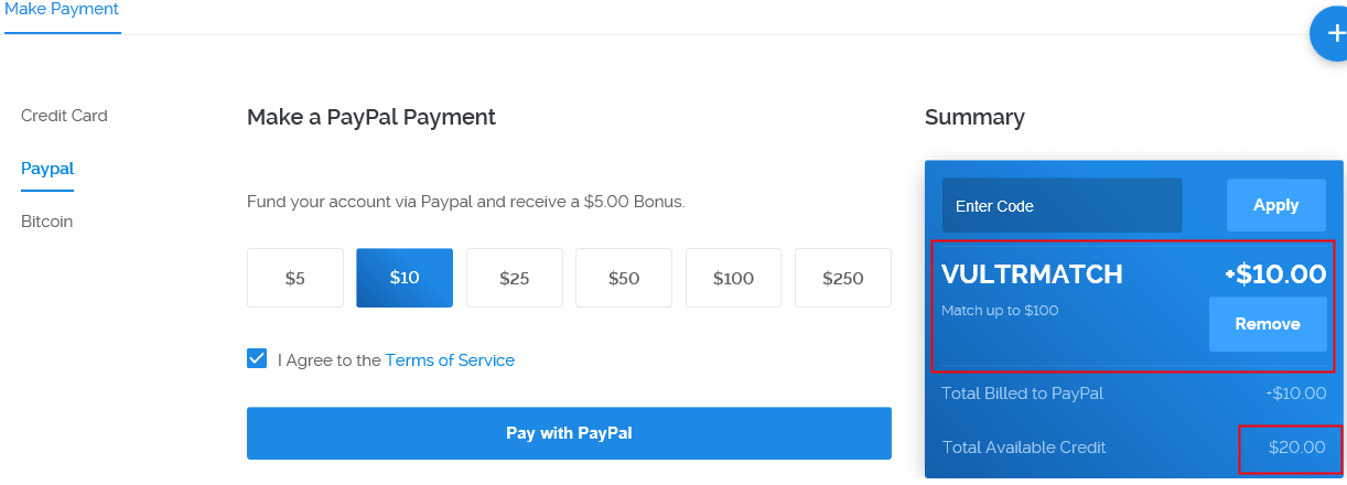 如果说你没有信用卡,但是你有Paypal 账号,那么你需要在Enter Code 处使用优惠码: VULTRMATCH 获得冲多少送多少活动,最高赠送100美元。