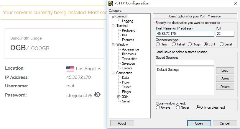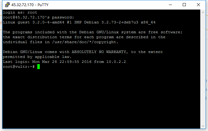 按照上面的配置信息我们登录putty,注意vultr 端口号是22. 初次登录密码就是 Password 里面的信息(上图中SSH管理密码),登录后就是我们常规的操作了。