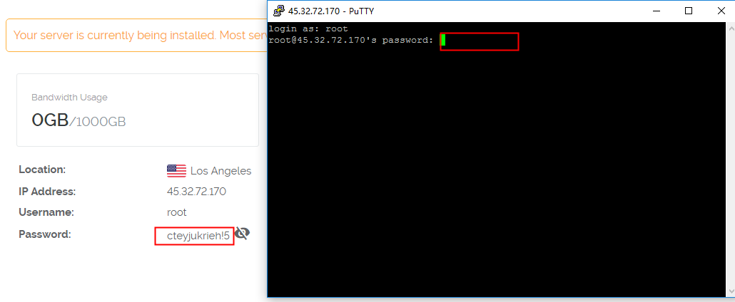 putty的密码输入进去是不显示的,所以这里的正确操作步骤是:先复制vultr给的密码,注意复制的密码前后不能有空格(如上图正确密码cteyjukrieh!5),然后先鼠标左键点击下putty软件,再在绿色光标那里鼠标右键一下,然后回车键(Enter建)。这里最关键,好多朋友密码总是输入不对,要么是密码复制错误多了空格,要么就是因为没有看到密码显示就多鼠标右键,多复制了几次密码。正确复制密码回车后的界面是这个样子。