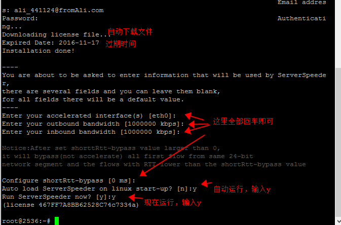 根据屏幕提示输入 serverSpeederInstaller 其他信息默认,遇到Y或者N的地方,全部选Y.
